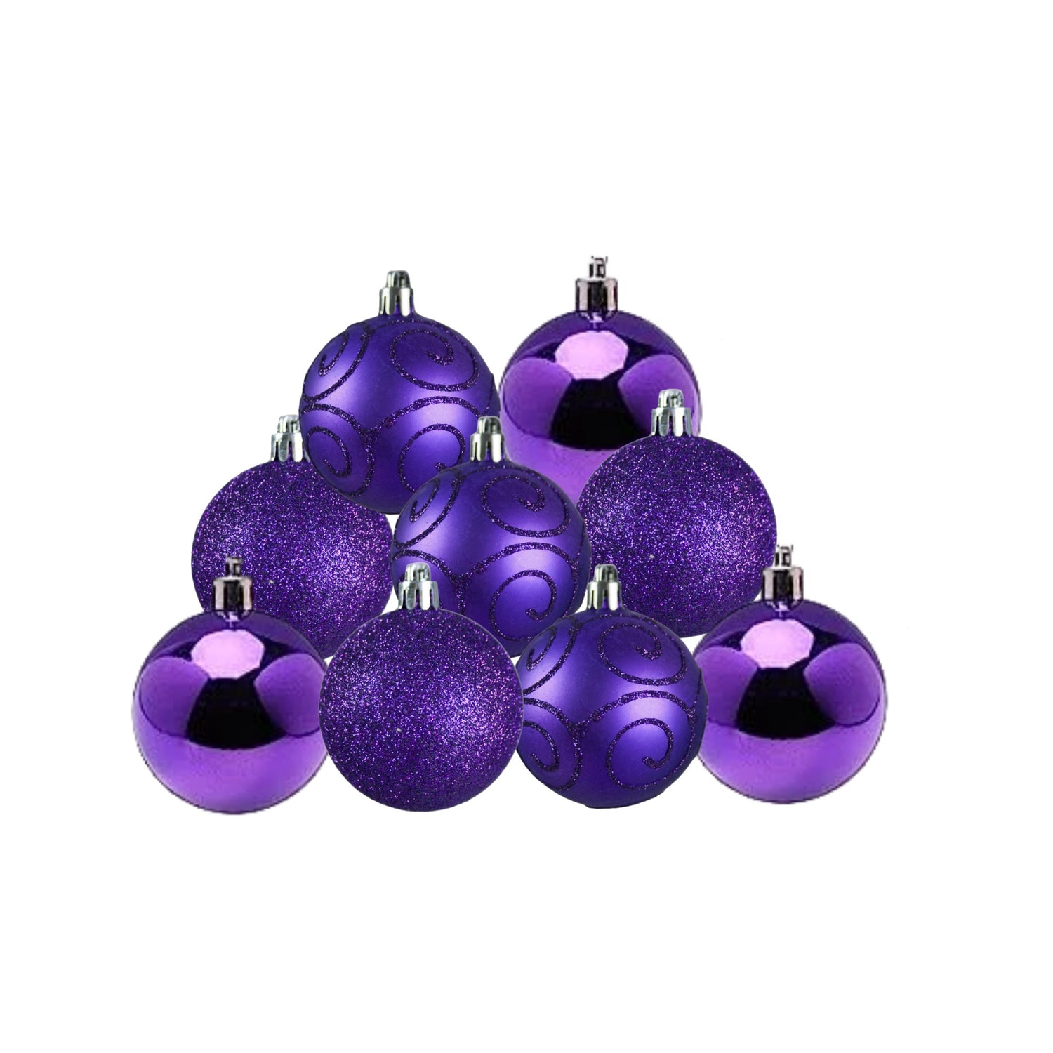 Each pack consists of nine shatterproof baubles with assorted decorative finishes.