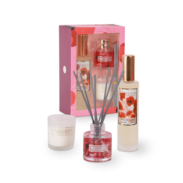 This beautifully packaged gift set featuring three delightful home fragrance products. A room spray to swiftly banish odours and create instant ambience. A reed diffuser for long lasting flame free constant aroma, and a mini candle made from sustainable soy wax. This gift set features the ‘With Love’ fragrance. A best selling scent of sophisticated sweet floral notes, infused with zesty citrus and warmed amber, wrapped in sweet musk.