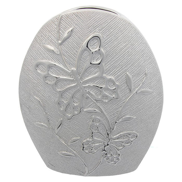 - Textured champagne silver vase with raised polished silver Butterfly design